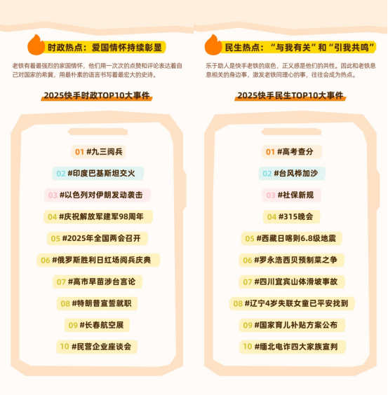 报告显示,快手用户既关注家国大事,也聚焦日常生活。他们对普通人的故事、节日热点、区域动态和民间赛事表现出强烈共鸣,形成了平台独特的情感基调。