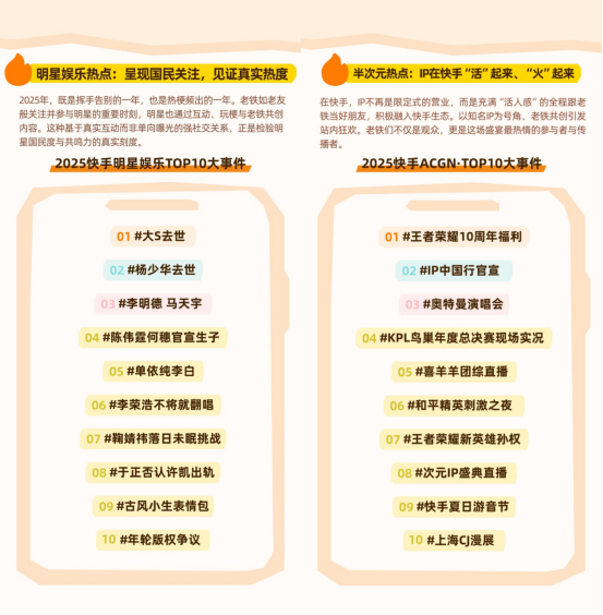 2025年1月至12月,快手用户每月最关注的事件依次为:春节、大S去世、315消费者权益日、中方反制美国加征关税、高考季、拉布布爆火全球、那艺娜巡演、快手超级夏晚、阅兵、赵鸿刚参加世界扇耳光大赛、KPL年度总决赛以及喀什杯足球邀请赛。