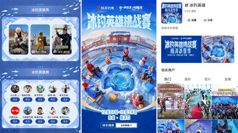 近年来,冰钓成为快手钓鱼生态的优势内容,板块汇聚@薇薇爱钓鱼、@大鹤爱钓鱼 等冰钓高手。为进一步激发冰钓达人创作潜能,快手在东北地区打造了一系列冰钓赛事:从2024年的「快手冰钓英雄挑战赛」,到2025年初的「快手村冬奥冰钓赛」,再到「全国民族民间快手冰钓公开赛」,高效打破钓鱼运动与冰雪场景的壁垒,有力促进“冰雪+体育+文化+旅游”的深度融合发展。