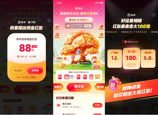 2月4日至23日,快手开启“摇一摇领红包”活动,用户完成全部进度红包,100%解锁后可获88元现金。2 月 15 日至 16 日迎来福利高峰。2 月 15 日辽宁卫视春晚期间,快手将发放专属红包雨,单场最高奖金达 10000 元;2 月 16 日除夕当天,全天整点红包雨持续上线,单场最高同样可赢 10000 元。