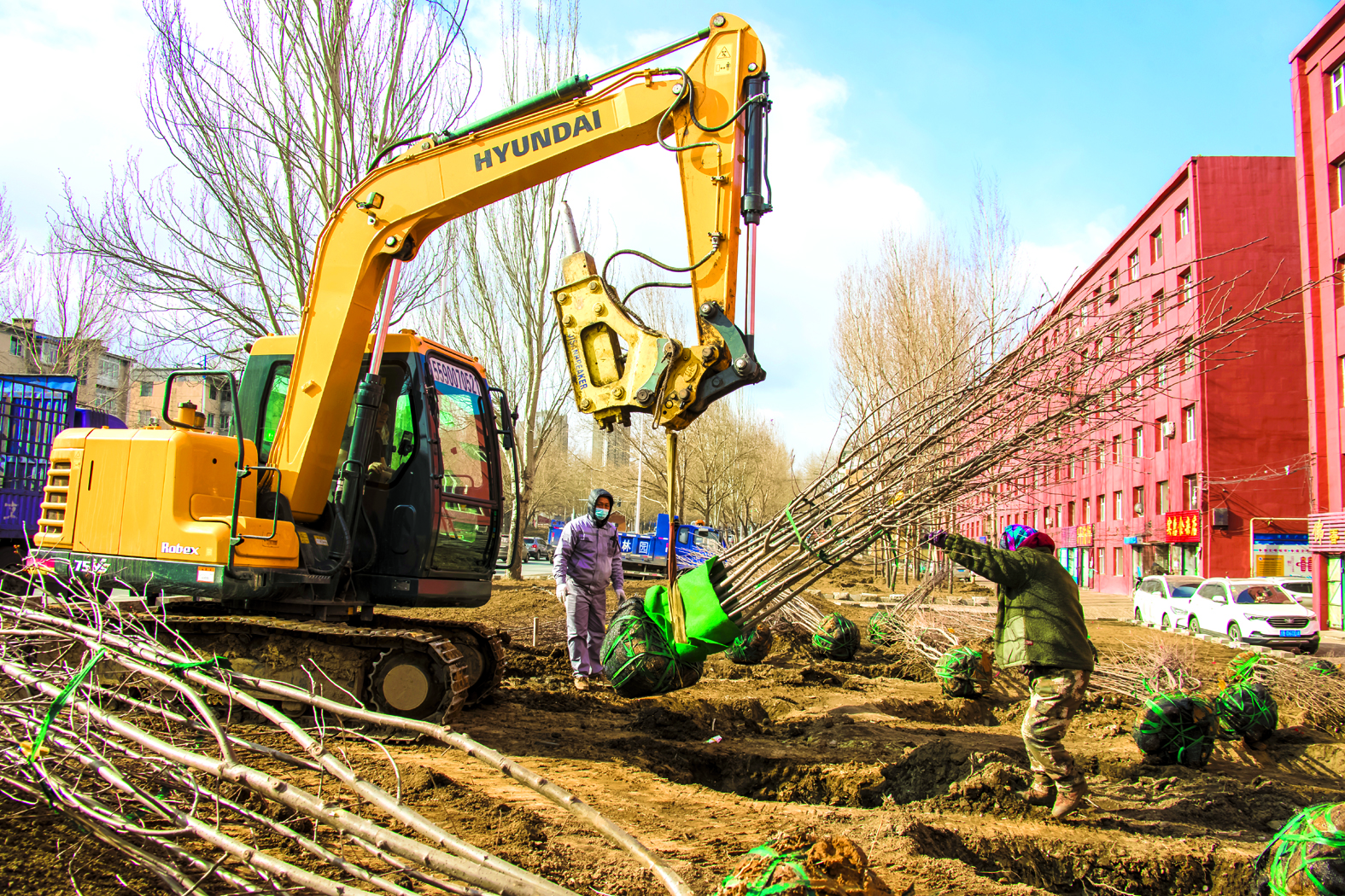 3月16日,在和平路与铁合西路交会处,大型机械正在吊卸树苗,绿化工人忙着清理场地、更换土壤、栽种乔木灌木树苗。昌邑区住建局园林处全面开启春季和平路绿化提升整体改造工程。