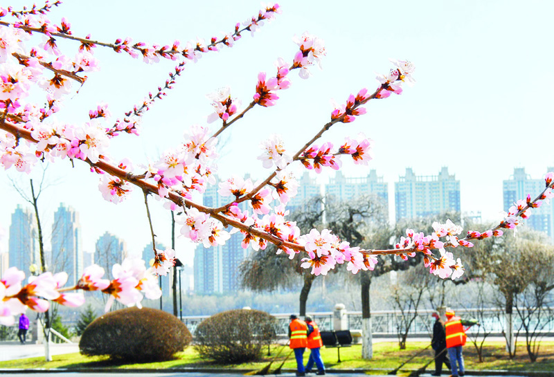 松江东路上,一株京桃树在春风的吹拂中绽放了花朵。随着连日来气温的升高,松花江两岸春色渐浓,小草吐出了嫩芽,路边的京桃树、杏树竞相开放。