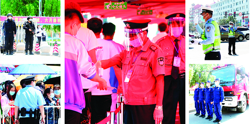 图①公安特警大队在考场外上岗执勤。图②城管部门在每个考场外设立栏杆划分区域,以保障场外秩序安全。图③吉林二中考场,在安保人员的指引下,考生通过测温验证通道有序步入考场。图④公安交管部门出动警力在考场附近路口疏导交通。图⑤消防支队高新大队在考场外执勤。