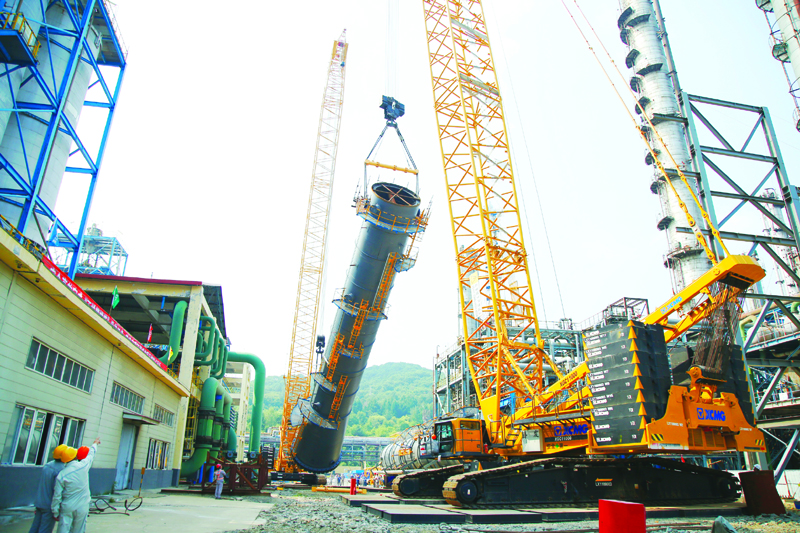 日前,吉林石化丙烯提纯项目新建丙烯精馏塔T-5122下段安全顺利吊装就位,下一步将完成中段及上段吊装和空中组对焊接施工,标志着该项目钢结构及设备安装进入高峰期。图为大型吊车正在起吊安装丙烯精馏塔下段。