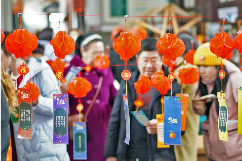 下午1时许,吉林西站内人头攒动。民俗互动体验区高高悬挂的红灯笼下,200条灯谜引人驻足流连。“我猜这两个谜底一个是水桶,一个是帐篷。”市民白阿姨拿着写有谜面的纸条,兴高采烈地前往兑奖区领取了两份小礼品。