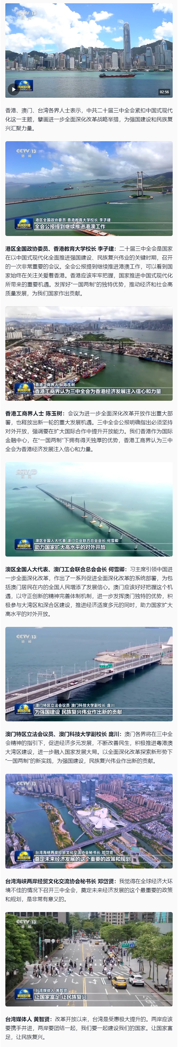 原标题: 港澳台各界人士表示中共二十届三中全会为民族复兴汇聚力量