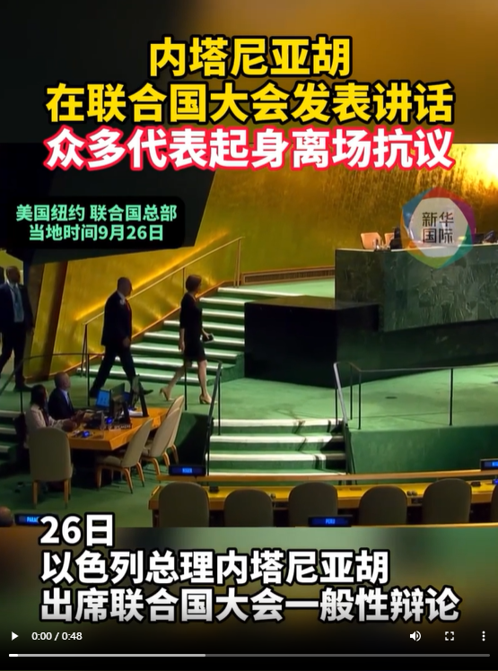 最戏剧性的一幕,出现在26日以色列总理内塔尼亚胡在一般性辩论发言时。他刚上台,许多会员国代表就纷纷起身退场,以示对以色列在加沙地带战争暴行的愤怒。不少人径直从内塔尼亚胡面前走开,代表席顿时空空荡荡。