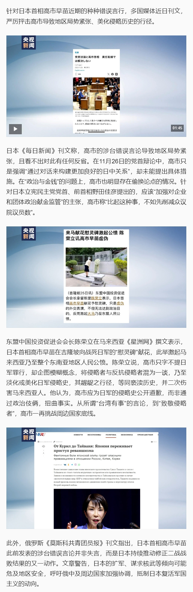 原标题: 视频丨多国媒体刊文严厉抨击高市早苗错误言行