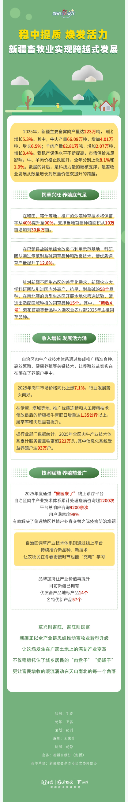 2025年,新疆深入实施畜牧业振兴行动,“牧九条”等政策成效持续显现,畜牧业生产企稳回升、再攀新高,主要畜禽肉产量达223万吨,同比增长5.3%。数据的背后,新疆畜牧业发展的硬核支撑是什么?今天的《数说“新”变化》一起来看看。