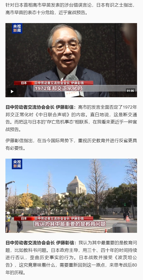 原标题: 视频丨日本有识之士:高市错误言论十分危险