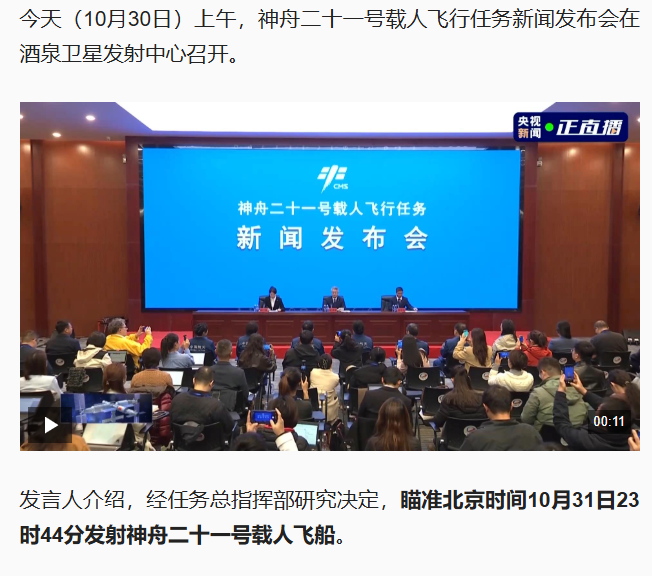 原标题: 视频丨定了!神舟二十一号瞄准10月31日23时44分发射