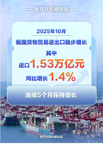 海关总署11月7日发布数据显示,今年10月份,我国货物贸易进出口总值3.7万亿元,其中,进口1.53万亿元,同比增长1.4%,连续5个月保持增长。