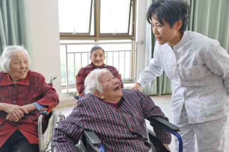 2023年2月14日,李楠楠(右一)在南通常青乐龄护理院和老人聊天。