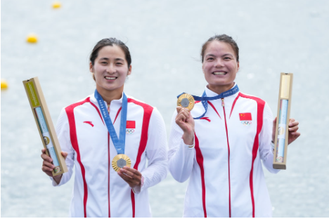 2024年8月9日,中国组合徐诗晓(右)/孙梦雅在巴黎奥运会皮划艇静水女子双人划艇500米决赛中夺得冠军后,在颁奖仪式上展示金牌。