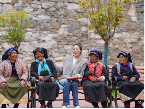 2025年5月16日,全国人大代表、四川省阿坝藏族羌族自治州马尔康市老年养护院院长格西王姆(中)和养护院的老人们交流。格西王姆除了管理和照料老人们的饮食起居,还把国家对老人们的关心关爱政策用“摆龙门阵”的方式传达给他们,将养老产业未来的发展前景及时分享给年轻同事和护工们。