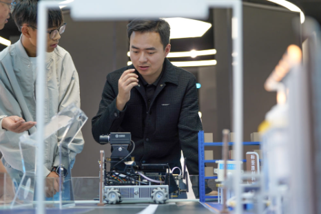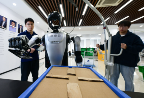 2025年10月24日,张鸿伟(左)在合肥乐聚机器人技术有限公司实验区域内观察机器人抓取零件测试运行情况。张鸿伟是一名机器人应用开发工程师,他通过编写代码、调试模拟,“教”人形机器人进行工业生产任务。