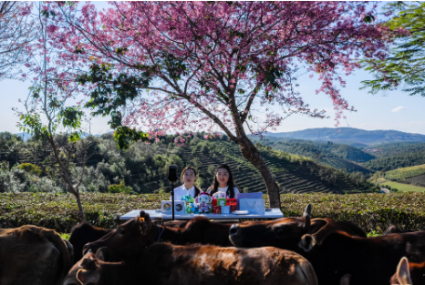 2025年12月22日,在云南省西双版纳傣族自治州景洪市大渡岗乡,魏春(右)和大渡岗乡党委书记王旭君在直播推介乡村美景与特色商品。魏春是一名“农村集体经济经理人”,她返乡后整合资源、推动乡村品牌建设,带动村民增收,激活乡村活力。