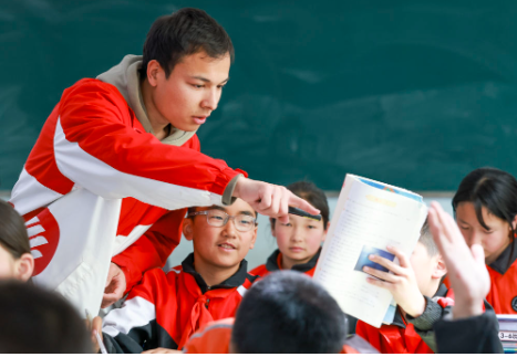 2025年4月23日,在新疆克孜勒苏柯尔克孜自治州阿图什市哈拉峻乡谢依特小学,支教教师麦麦提伊敏·库迪热提给学生上课。他所服务的戍边支教西部计划志愿者服务队,在这所边境小学辛勤耕耘,用教育为祖国边疆播种希望,并因此荣获中国青年五四奖章。