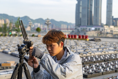 2025年5月1日,陆子祥在重庆市南岸区调试无线网桥设备,为无人机灯光秀做准备。陆子祥和同事负责规划无人机灯光秀的飞行路径并执行表演方案,用科技为城市夜景增添璀璨光彩。