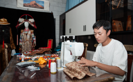 2025年9月11日,藏装设计师班珠丹塔在位于拉萨的家中缝制藏装。他将藏族传统艺术元素与现代设计理念相结合,让藏服焕发新的时尚活力,其作品登上国内外文化舞台,诠释着传统之美。