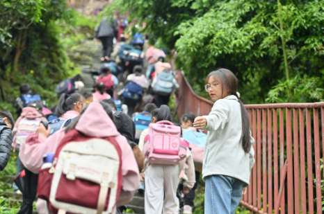 2025年4月30日,广西融水苗族自治县杆洞乡高培村小学校长梁巧(右)护送放学的孩子们回家。梁巧扎根大苗山深处,为乡村教育贡献力量。