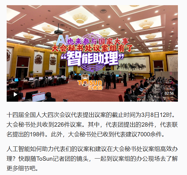 原标题: 时政Vlog丨AI也来参与国家大事 大会秘书处议案组有了“智能助理”