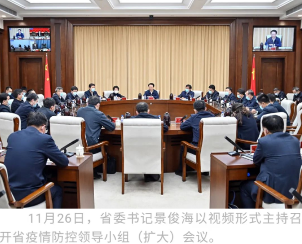 11月26日,省委书记景俊海以视频形式主持召开省疫情防控领导小组(扩大)会议,对全省疫情防控工作再调度、再研判、再部署。他强调,要深入贯彻习近平总书记关于高效统筹疫情防控和经济社会发展的重要讲话重要指示精神,始终坚持“三个坚定不移”,立足于防、立足于早、立足于快,采取更为科学精准、坚决果断措施,尽快遏制住疫情扩散蔓延势头,坚决打赢这场硬仗。省委副书记、省长韩俊出席会议并讲话。