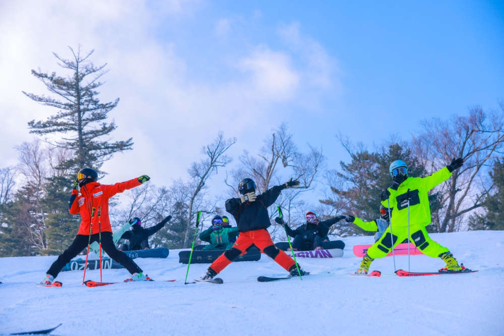 滑雪爱好者在长白山万达国际度假区滑雪场滑雪前热身。