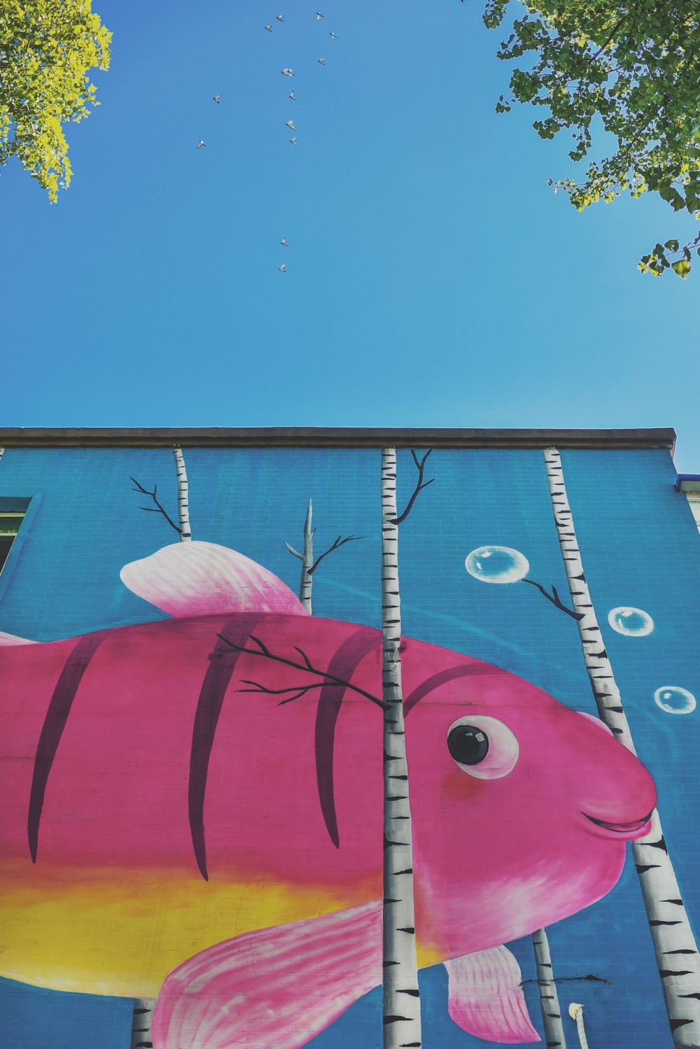 一群鸽子飞过长春市一栋绘有墙面彩画的居民楼。