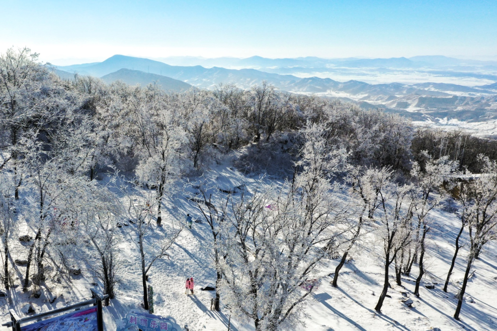 游客在吉林市万科松花湖度假区观赏高山雾凇景观。