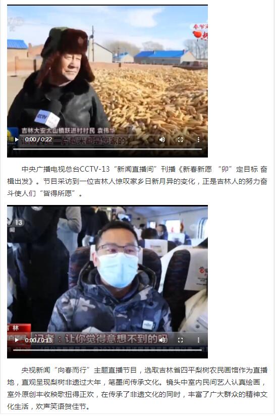 中央广播电视总台“新闻联播”采访了吉林省大安太山镇跃进村村民的新春新愿,2022年喜获丰收,2023年信心满满,再出发!CCTV-13“新闻直播间”采访到一位吉林人惊叹家乡日新月异的变化,正是吉林人的努力奋斗使人们“皆得所愿”。央视新闻客户端通过直播的方式,将四平市梨树辽河农民画艺术全方位、多角度地展现出来,传承非遗过大年的浓厚氛围蕴藉其中。