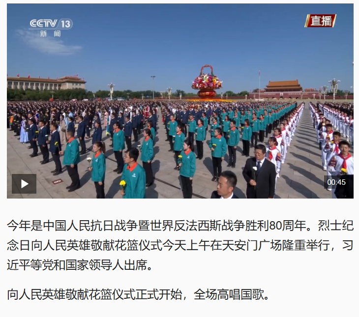 独家视频丨向人民英雄敬献花篮仪式正式开始 全场高唱国歌