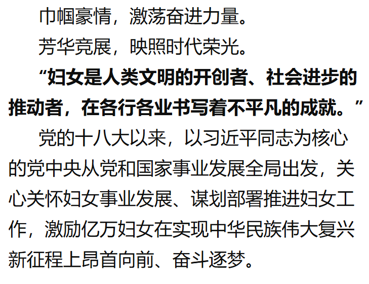 心怀伟大时代赋予的美好梦想,广大妇女在中国式现代化的新征程上,担当作为、绽放光彩。