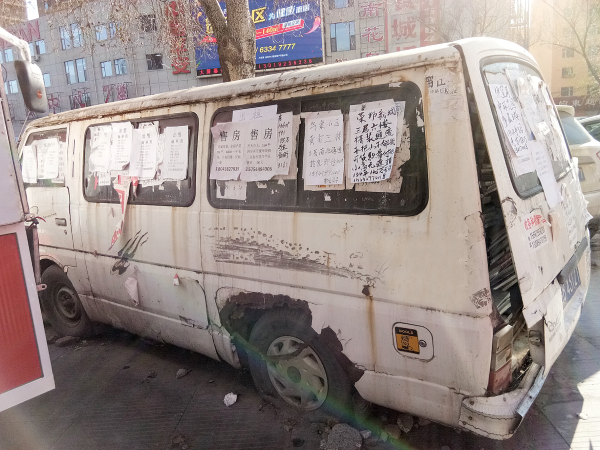 松花江网讯 在厦门街与泰山路交会处附近人行道上,停着一辆贴满野广告的“僵尸车”。这辆车是一辆面包车,后备箱已开裂,轮胎已没有气,车内放着破烂物品,车的外面贴满了野广告。