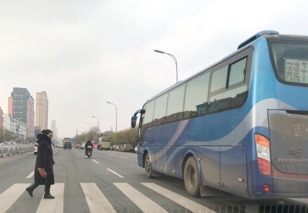近日,在桃源路与北宁胡同交会处附近,行人走斑马线过马路,一辆客车不礼让行人抢先行驶过去。