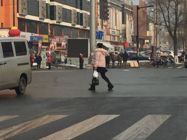 近日,在吉林大街与恒山路交会路口,一名市民不仅不按照交通指示灯通行,还未走人行横道过马路。