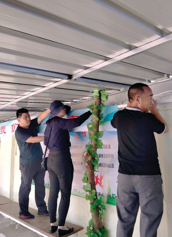 图② 社区工作人员和居民在高温下对遮阳棚进行美化裝饰。