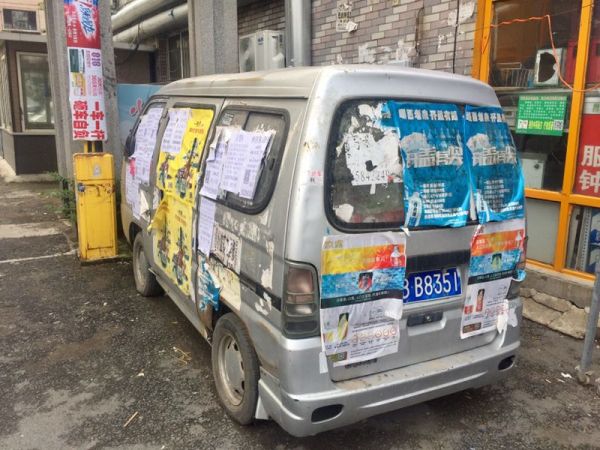 “每天回家到小区大门口,一辆停了有半年左右的面包车上,野广告贴得跟狗皮膏药似的,看了真堵得慌。”家住丰满区烽火C区的朱先生反映。