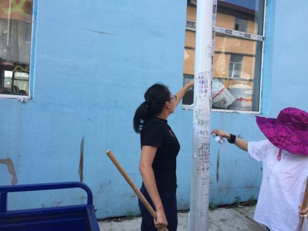 本次活动针对社区主要街路、宣传栏、居民小区的野广告进行集中清理。志愿者拿着铲子一张一张仔细铲除野广告,墙面上、宣传栏上、地面上……力争全面清除。有些地方野广告贴了一层又一层,数量较多且粘得太牢,给清理工作带来了一定的难度。志愿者用抹布擦,用刀刮,不给野广告留下一丝生存空间。