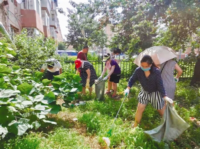 在环境整治行动中,社区将每个周六设为劳动日。每逢劳动日,社区工作人员全员“上岗”,手持工具,对绿化带内的各种垃圾进行全面彻底清除,不放过每一处死角和每一个盲点。在植物密集地段,大家用手细致地清除垃圾;工作人员不怕脏、不怕累,拿着锹配合铲车把建筑垃圾全部清除。