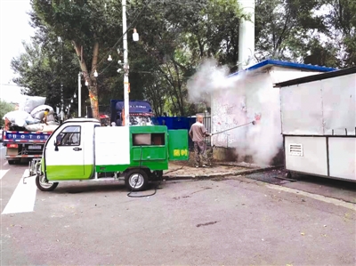 据丰满区创城办的一位负责人说,丰满区环卫处近年新进了两辆专业清污车。这款车是一种采用高温高压水枪冲击和温融一些难以清理的油漆污垢,效果很好,而且效率也很高。