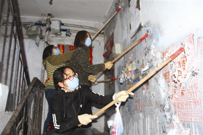 当天,龙潭区司法局20人来到广西社区辖区,与社区工作人员、志愿者一起清理弃管小区外墙体和楼道内野广告。大家手拿喷壶、刷子、铲子,利用近两个小时,将野广告彻底清理,并将清理下来的垃圾清扫干净。