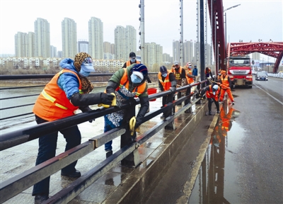 图① 丰满区环境卫生保洁管理处组织环卫工人在江湾大桥上清洗路面、擦洗护栏。