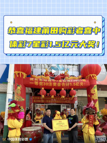 原标题: 恭喜福建莆田购彩者喜中体彩7星彩1.5亿元大奖!
