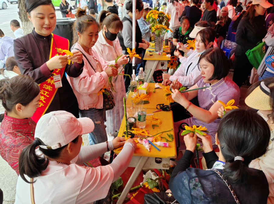 在遮阳棚下,许多家长正围坐在一起,每人手里都拿着扭扭棒、绿色线绳等材料,专心致志地制作着手工向日葵。