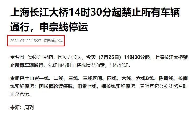 记者查询发现,该网传截图实际为去年7月25日的一则新闻,当时是受台风“烟花”影响,上海长江大桥一度封闭。
