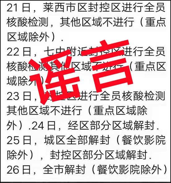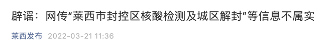 3月21日,青岛莱西市疫情防控工作指挥部发布辟谣信息,网传“莱西市封控区核酸检测及城区解封”等信息不属实。