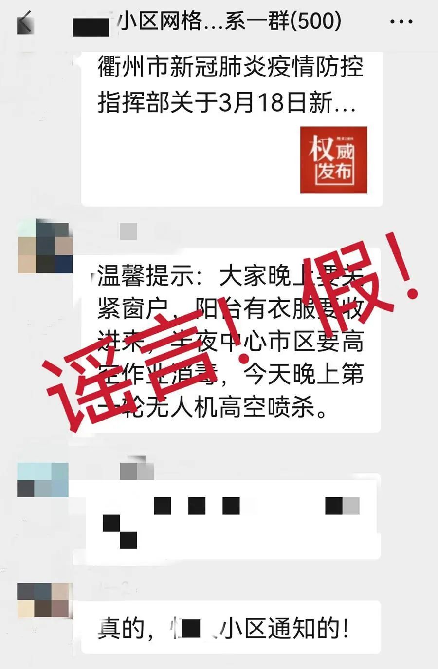 此外,3月19日晚上,衢州本地部分微信群出现一条关于“无人机高空消杀”的“温馨提示”,转发者还表示“真的”“在市区”,引发网友关注和质疑。