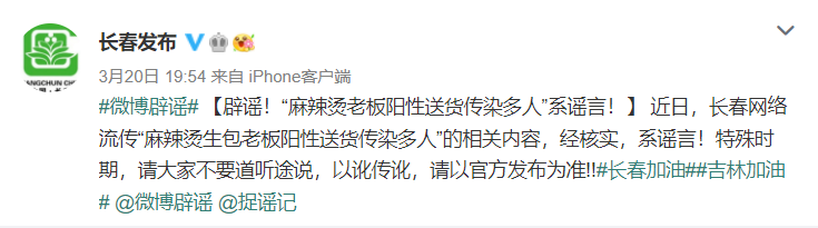 近日,长春网络流传“麻辣烫生包老板阳性送货传染多人”的相关内容,经核实,系谣言!特殊时期,请大家不要道听途说,以讹传讹,请以官方发布为准!
