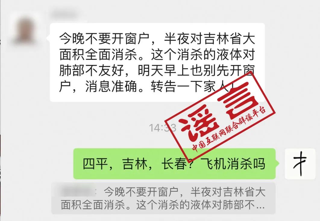 近日,一条“提醒”声称,不要开窗户,半夜将对吉林省大面积全面消杀。